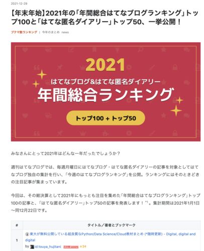 なんとこのblogの記事が2021年の年間総合はてなブログランキングでトップを取得してしまいました。 blog.hatenablog.com 読んでくださった皆様に感謝です。年末年始はやはりblogを書こうかな