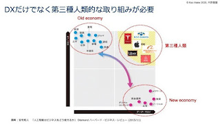 日本最高の戦略家の一人である安宅さんのDXの定義も、"DXはOldエコノミーが、AI×データ化すること(下の図で右に行くこと)"とされています。当然、その実施にあたってはcomputer scienceが前提となるのです。